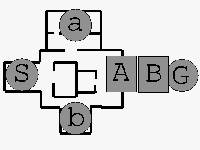 A very basic level design giving an idea of how a level is built on the flow. The keys 'a' and 'b' could be in any position, but they're generally placed away from eachother to promote exploration.